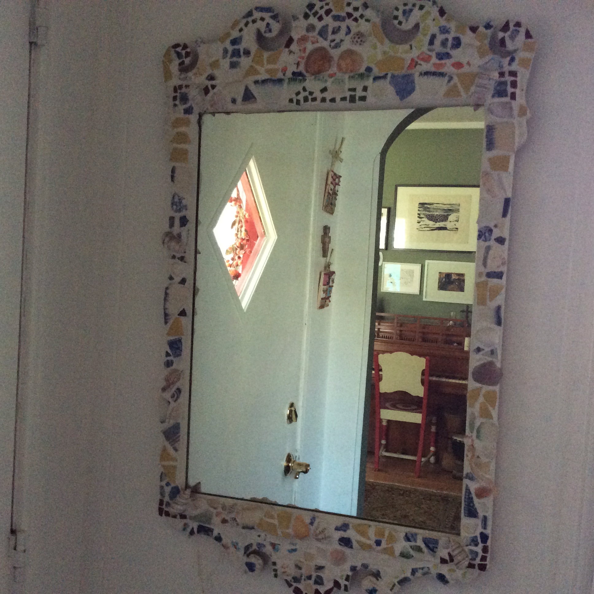 When I started making mosaics I realized that broken dishes are simply objects needing a new life. The energy of possession that the object once held is transformed. Now when a dish breaks I ask: what will this become?