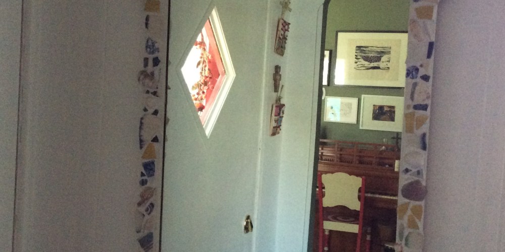 It doesn’t surprise me to find a bag or box of broken dishes on my front porch when I return home. One friend handed me a broken plate, a gift from her great aunt. In tears, she asked me to make something new from the pieces. Great Aunt Helen’s plate is now a mosaic bud vase.